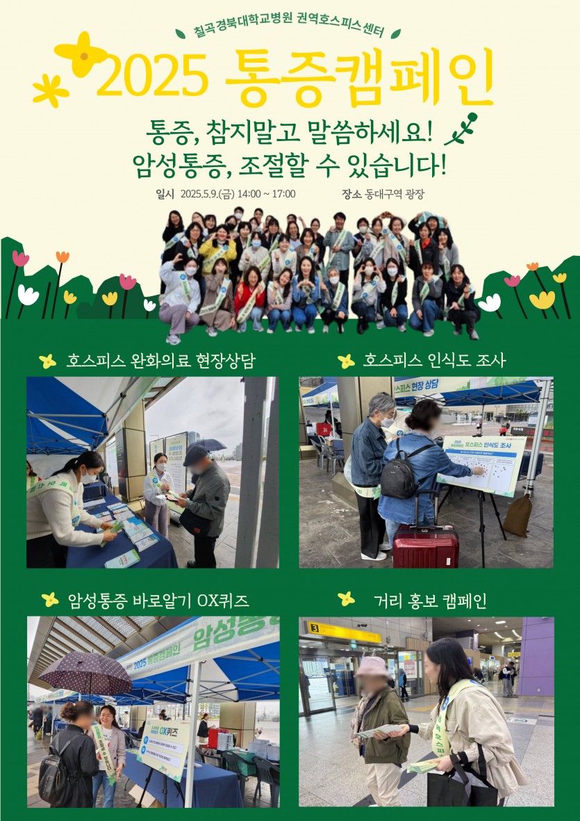 본 캠페인은 대구·경북 호스피스전문기관 협의체(16개 기관)와 협력하여 홍보 부스 운영(현장 상담, 인식도 조사, 암성통증 바로알기 OX퀴즈) 및 홍보물품 배포 등 다양한 활동을 통해 지역 주민을 대상으로 암성통증에 대한 올바른 정보를 전달하였습니다.