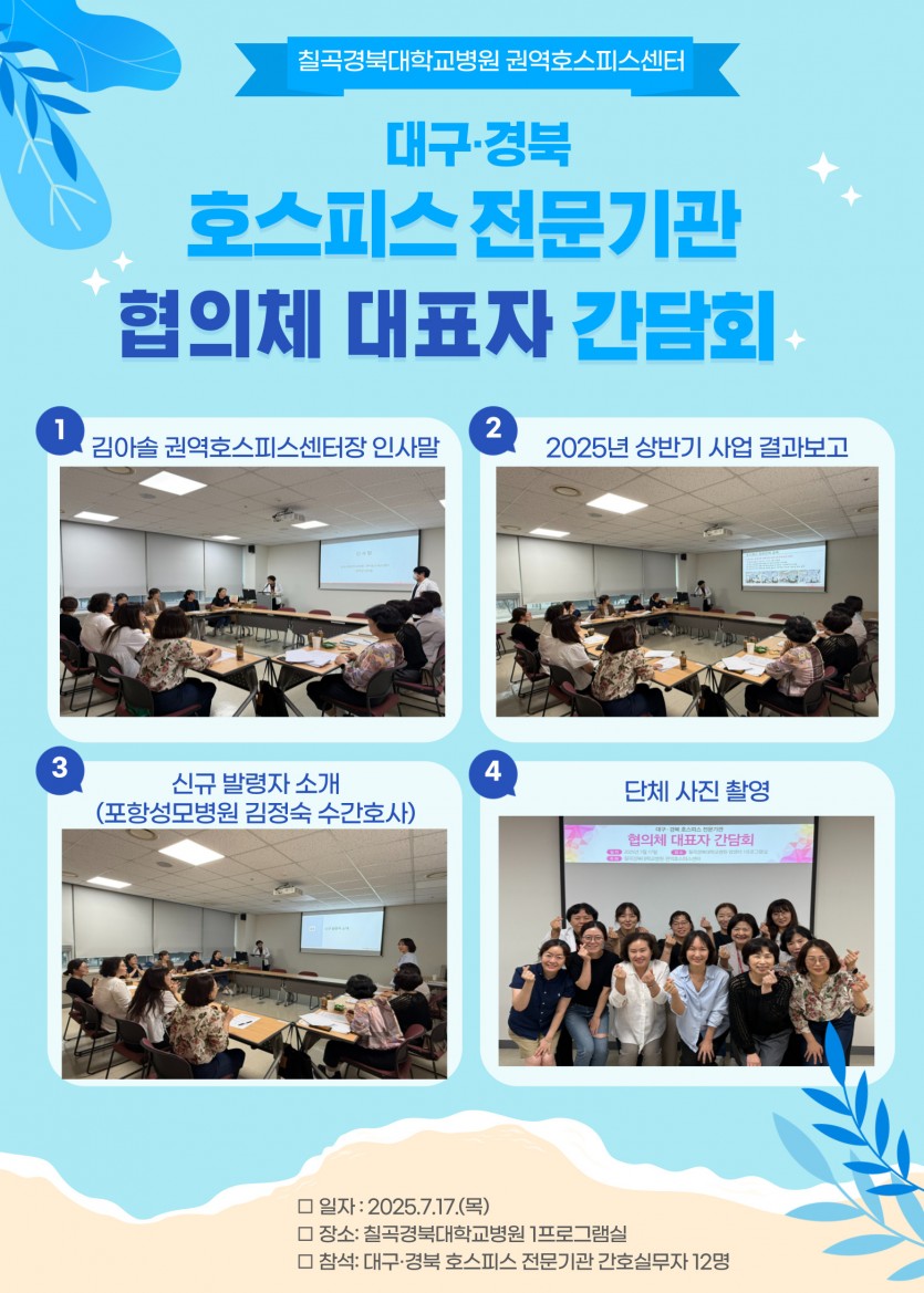 칠곡경북대학교병원 권역호스피스센터에서는 2025년 7월 17일(목) 칠곡경북대학교병원 1프로그램실에서 「2025년 대구·경북 호스피스 전문기관 협의체 대표자 간담회」를 개최하였습니다.